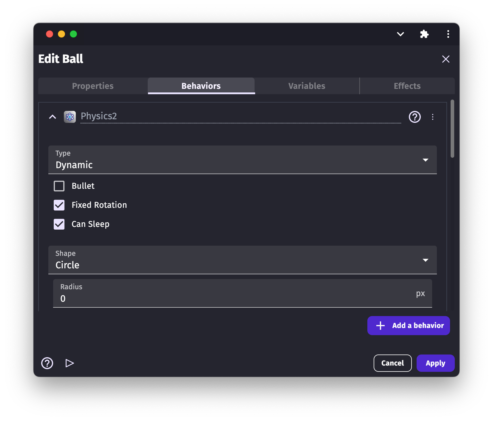 When you add the Physics behavior to an object, you can set the body configuration right from the IDE. There are many options to play with. They have been categorized below. .