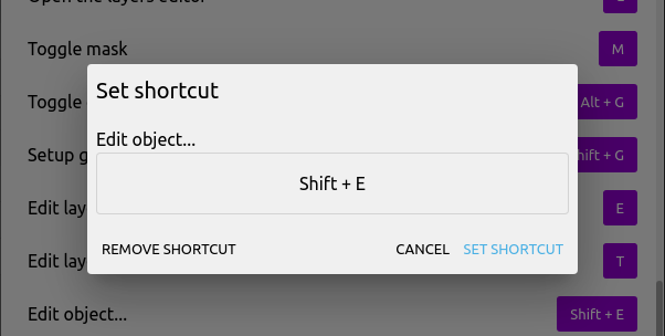 Some commands/shortcuts can have sub-sections (e.g., Edit Objects).